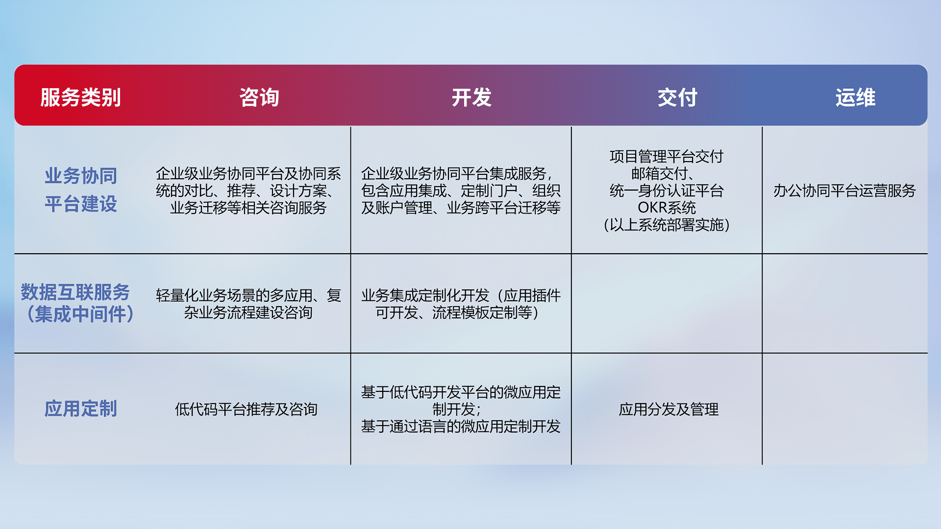 针对钉钉、、、、企微、、IDaas等平台级产品提供产品的规划、、、、方案、、、、交付、、、定制化开发等服务,,实现如统一协同办公、、、智能客户服务、、、、混合会议管理、、、智能数据查询、、等业务场景,,,实现数字化转型。。。。