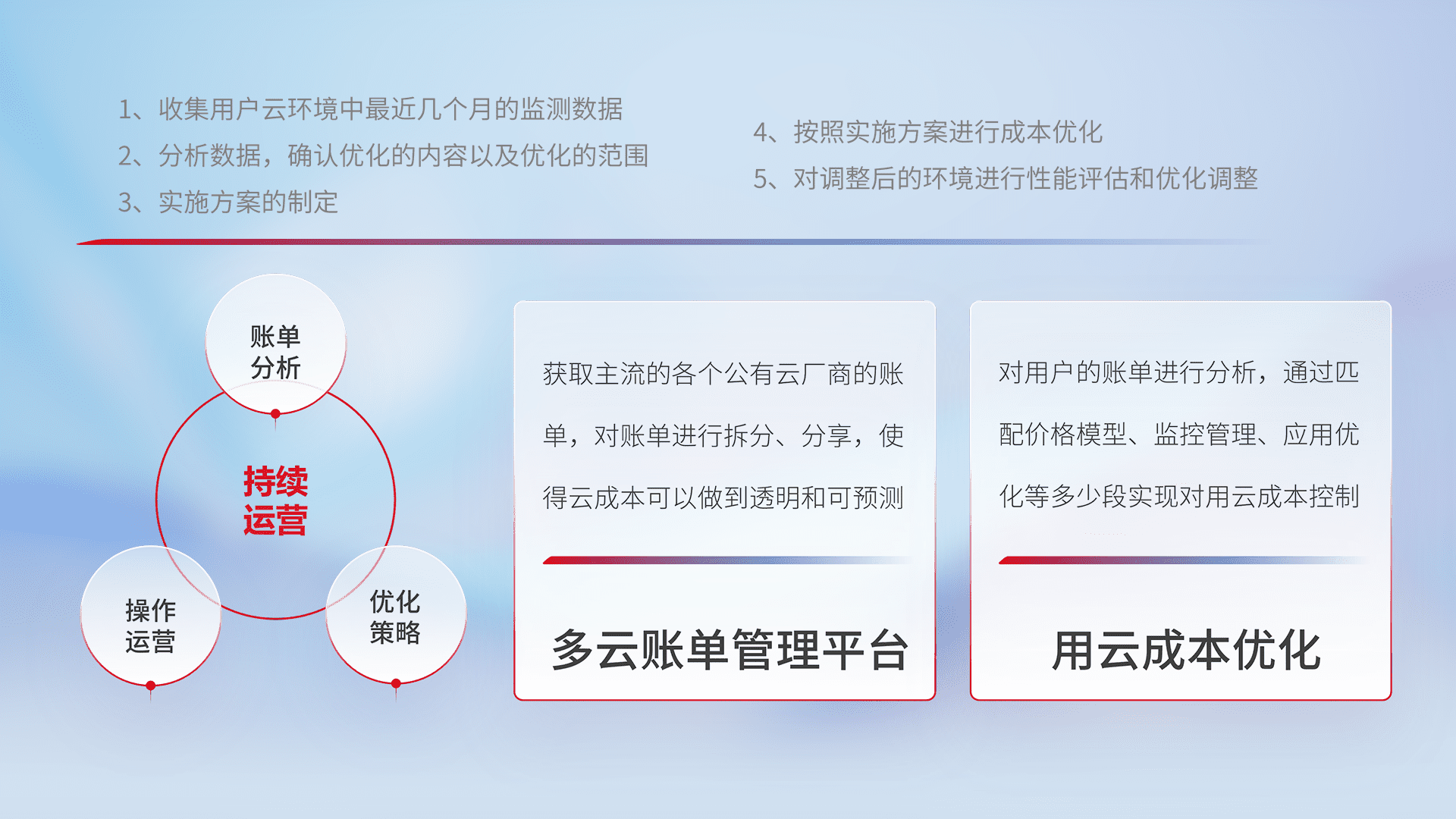 通过多云纳管,,以统一的资源数据模型把客户的云资源进行抽象和封装,,,进而实现对多云资源的统一操作,,,保障云资源管理的可靠性、、、、稳定性与可用性。。。。量身定制化运维内容,,,配置、、开发运维、、、补丁管理、、、备份、、、监控、、认证和访问管理、、审计和日常巡检等,,,,保障在用云过程中的可靠度,,,,稳定度以及高可用率。。。