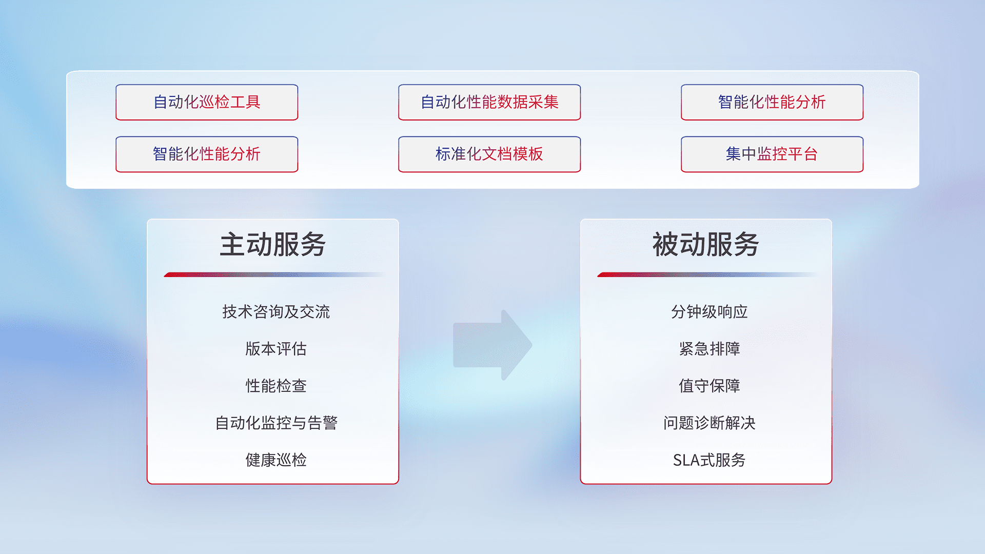智能化工具和标准化文档,,,,保障服务质量,,,提供主动服务(包含技术咨询、、、版本评估、、、性能检查、、自动化监控与告警、、、健康巡检)和被动服务包含(分钟级响应、、、、紧急排障、、、、值守保障、、问题诊断解决、、、、SLA服务)。。。。